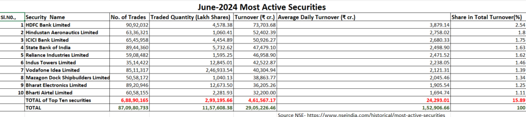 Most Active Securities in June 2024: According to NSE data, the most actively traded securities in June 2024 were led by HDFC Bank, followed by HAL (Hindustan Aeronautics Limited), ICICI Bank, SBI (State Bank of India), RIL (Reliance Industries Limited), Indus Tower, VI (Vodafone Idea), Mazagon Dock Shipbuilders Limited, BEL (Bharat Electronics Limited), and Bharati Airtel Ltd.